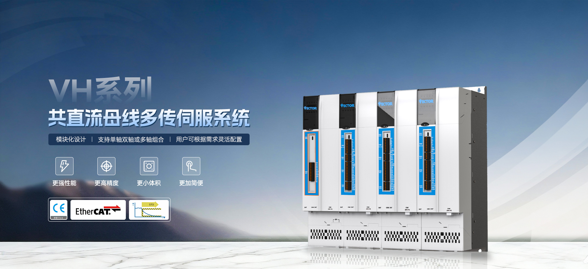 • VH系列采用高度集成的模塊化設(shè)計(jì),支持單軸、雙軸、多軸靈活組合,功率覆蓋 5.5kW~93kW,輕松適配不同設(shè)備需求,幫助用戶(hù)節(jié)省電柜空間,降低整體成本。