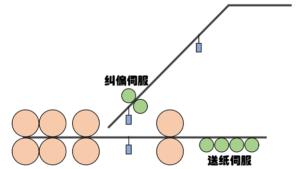 高速裱紙機(jī)運動控制器部分方案,主要控制面紙糾偏和送底紙功能,根據(jù)5個高響應(yīng)光電進(jìn)行位置信號采集,通過位置疊加和凸輪功能執(zhí)行需求動作。